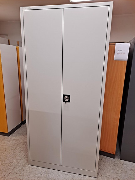 Erä käytettyjä, matalia Martelan ovikaappeja. Kaapeissa on harmaa runko ja metallijalat. Kansi ja lukittavat ovet aitoa pyökkiviilua.