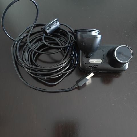 360° panoramanäkymällä varustettu autokamera, jossa on infrapunasyväyönäkö (IR) ja kaksikanavainen kuvaus (etu/eteenpäin + sisä tai käännettävä kamera). Laite on hyvässä kunnossa, kaikki varusteet mukana (kiinnike, johdot, liittimet) — katso kuva.