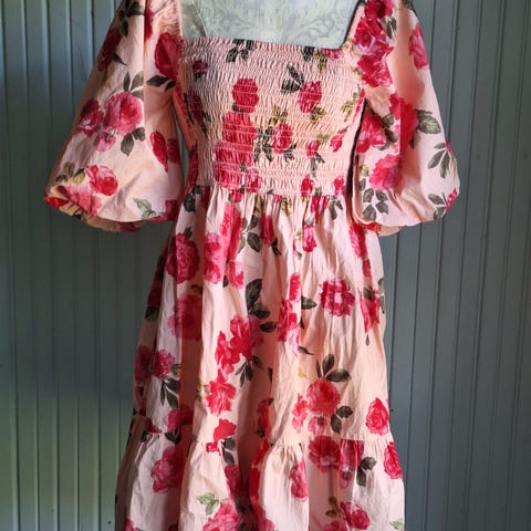 Myydään Vila-merkkinen v-aukkoinen, mustapohjainen kukkamekko. Keltaisia, oransseja ja vaaleanpunaisia isoja kukkia. Hihat läpikuultavat, muuten alla musta vuorikangas. Samaa kangasta oleva solmittava vyö. Ollut päällä kerran, ei käytön jälkiä.