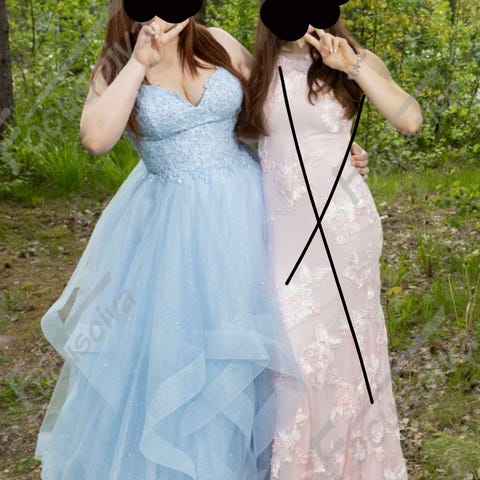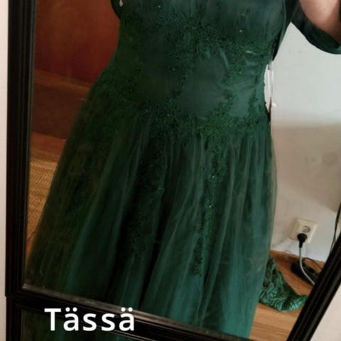 Upea kimalteleva juhlamekko koko XL. Kuvissa näkyy mitat. Lyhennetty helmaa 175cm käyttäjälle. Pidetty kerran juhlissa. Edessä halkio ja takana nyöritys + vetoketju. Hameosassa ollut myös alla tyllikerros, joka poistettu, mutta se on tallessa ja saa halutessaan ommella takaisin jos haluaa enemmän volyymia. Lyhennetyn palasen saa myös halutessaan takaisin pituuteen. Mukana myös ohut sifonki hartiahuivi.