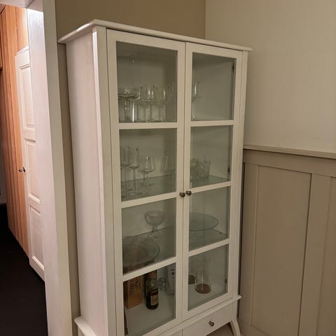 Ikea HAVSTA vitriinikaappi sokkelilla, massiivimäntyä. Valkoinen/kirkas lasi, koko 81x37x134 cm.