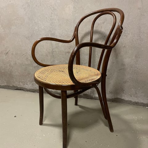 Melko matala ja vanha rottinkituoli. Maalattu kalkki maalilla beigeksi ja ollut lastenhuoneessa. Toisesta käsinojasta lähtenyt rottinkinauha mutta käyttöön ei vaikuta. Muuten ehjä ja tukeva suloinen tuoli vaikka parvekkeelle.