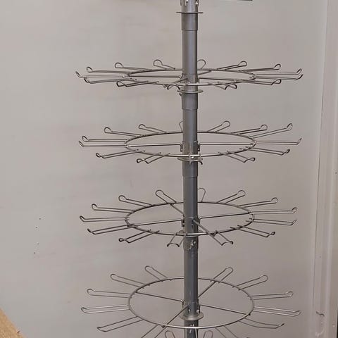Uudenveroinen pyöreä tornimallinen esittelyteline myymälään.