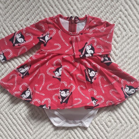 Mekko bodylla koossa 56cm(?). Meille käytettynä tullut. Hyvä, käytetty kunto 🫶🏻 En huomaa moitteita. Tuotteesta ei löydy lappua, joten en osaa sanoa kenen ompelema on.. Myöskään kokoa ei ole mainittu, mutta meillä käytetty 56cm koossa.