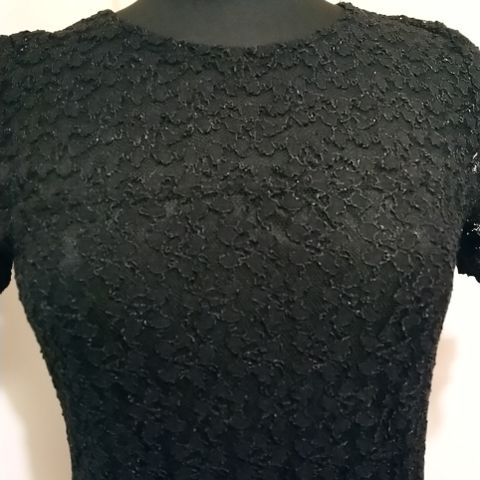 Kuvan vaalea pitsimekko, jossa edessä olevasta pitsinreunasta ommel purkautunut. Takana erilainen pitsiommel. Pitsiosio olkasaumoista kiinni ja alla alushame. Kai-kai 50cm ja kokopituus 100cm ja helmanleveys n. 80cm.