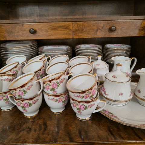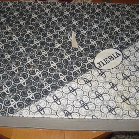 1980- luvulla saatu Liettuassa valmistettu käyttämätön, koristeena ollut 6 hlö Jiesia- posliinikahviastiasto, jälkiruokamaljat, sokerikko, kermakko, kannu ja maljakko.