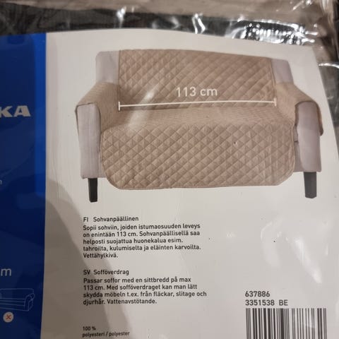 Myynnissä 3 kpl sohvaan tai tuoliin sopivia paksuja pehmusteita. Väri: luonnonvalkoinen pohja, siniset raidat. Pehmusteen pituus 110 cm, leveys 60 cm ja paksuus 15 cm.
