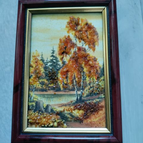 80 luvulta oleva meripihkataulu, luontoaiheiset 17cm x 14,5cm.