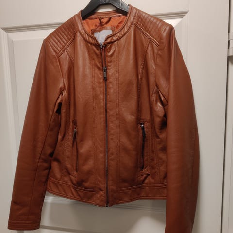 Siisti ja hyväkuntoinen lyhyt sininen tekonahkatakki. Ei vetoketjua tai nappeja, eli auki pidettävä. Hartioissa ja hihoissa niittityyppiset koristeet.