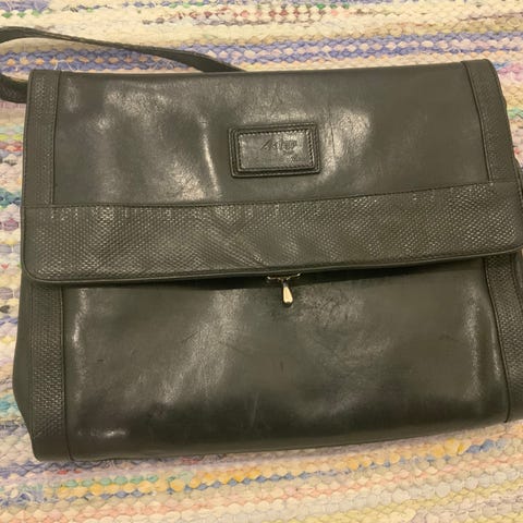 Aitoa nahkaa oleva käsilaukku. Mitat kuvissa, erittäin tilava. Irrotettava pidempi hihna. Erinomainen kunto, toisen kantokahvan purkauma siististi korjattu (ks. kuva). Mmm.