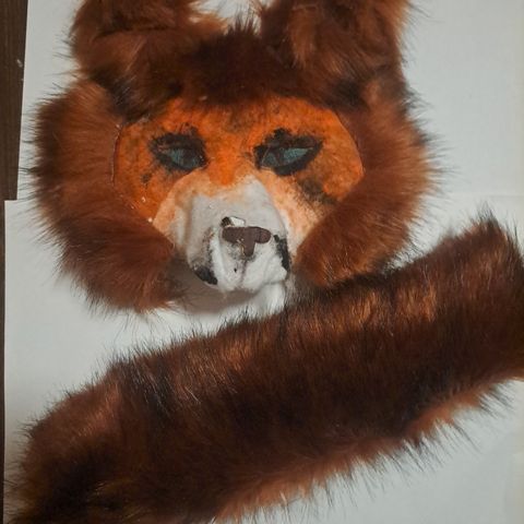 Itse tehty pahvinen kettumaski. Hieman käytetty leikeissä, mutta silti hyväkuntoinen. Pysyy hyvin päässä ja on naru joka pitää kiinni.