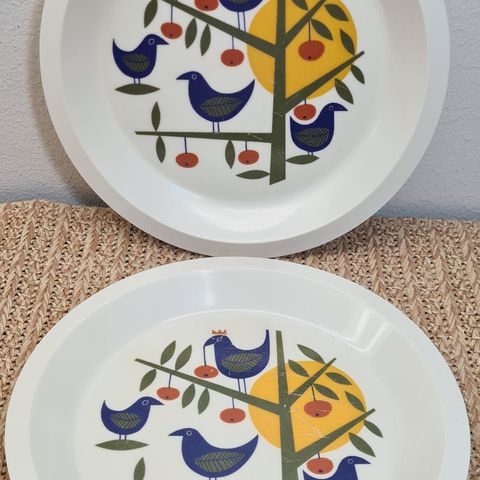 Kuvan hauskat vähän harvinaisemmat kuvioidut lastenlautaset, syvä ja matala. Pieniä hentoja viivoja saattaa tietyssä valossa näkyä, yleisilme siisti. Syvälautanen ja matala lautanen samalla lintukuviolla. Myydään yhdessä.