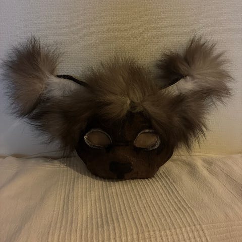 Hyväkuntoinen valkoinen ilves maski jota on käytetty leikeissä vähän.