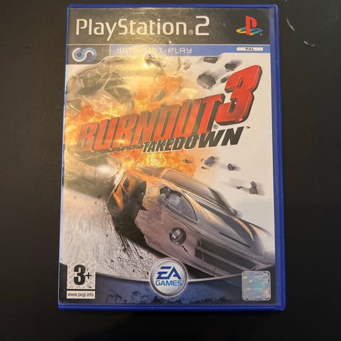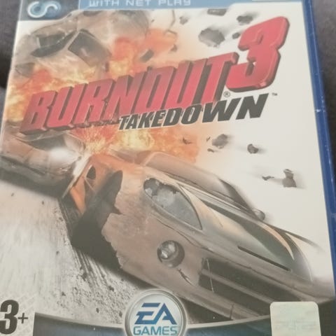 Myynnissä Burnout 3 Takedown. Pelkkä kansi ja manuaali. Kannessa taitos keskellä.