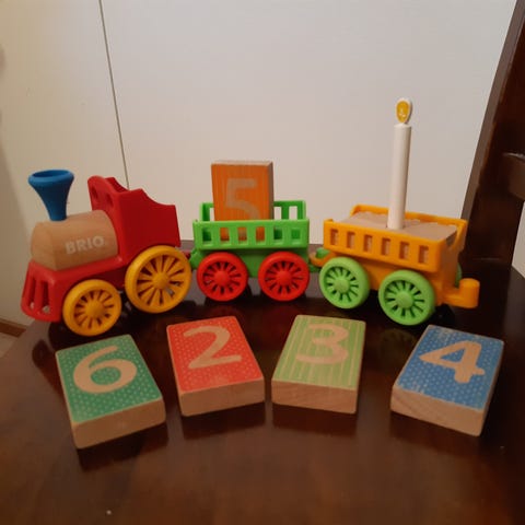Täysin käyttämätön puinen syntymäpäiväjuna. Sisältää veturin, kuusi vaunua, eläin- ja numerokoristeita, kynttiläpidikkeet ja kynttilät.