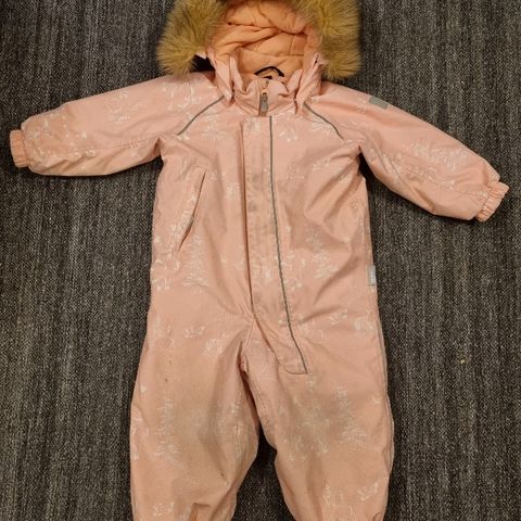 * Reima vaaleanpunainen haalari. Polvissa pehmentymää. Tässä haalarissa on aran värinsä vuoksi paljon pinttynyttä tummaa likaa (hihansuut, vyötärö, polvet, lahkeiden suut), joka ei lähtenyt normipesussa. Jalkalenkit puuttuvat.