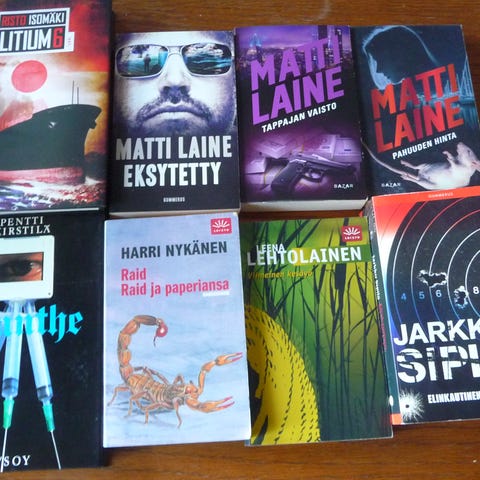 34 kappaletta kirjoja. Enimmäkseen dekkareita, mutta mukaan mahtuu myös muuta! Melkein kaikkien kirjojen kunto on uudenveroinen.