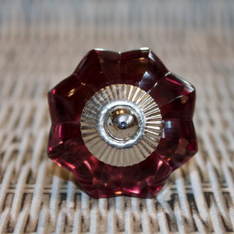 Lasinen vetonuppi, ns. melooninmuotoinen, kaunis sininen. Hopeansävyiset metallisosat. Nupit on käsintehtyjä, jonka vuoksi niissä on eroavaisuuksia toisiinsä nähden, koko, muoto, sävy.