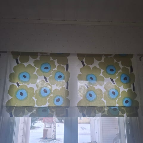 Verhon pituus 1,40 m ja leveys 3,50 m. Rypytysnauha ylhäällä ja sivuissa. Siisti ja puhdas. Kerran ollut ikkunassa. Kuvassa näkyy rypyt ollut pakattuna. Kangas tukevaa ja laadukasta. Kulkeutuu mm Loimaa,Forssa,Aura,Somero. Nouto ja postitus käy myös.