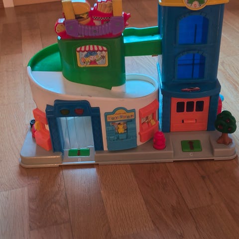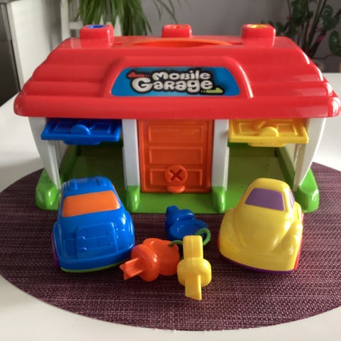 Myydän taaperoiden autotalli ja 2 siihen kuuluva autoa. Autotallissa on äänet,toimii pattereilla. Korkeus 35 cm leveys n.66 cm syvyys n. 40 cm
