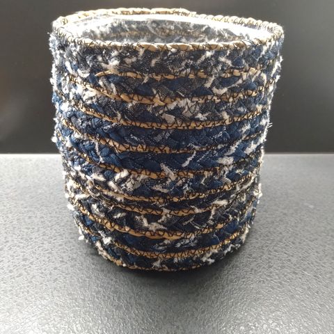 - Rönsyliljan alla (näkyy vähän huonosti kuvissa) pyöreä ulkoreunoiltaan kuvioitu sinkkipurkki, joka levenee ylös päin, yläosassa parin sentin levyinen reunataso. Istutukseen, asetelmiin, säilytysastiaksi, ruukkukukalle tms., hinta 6e.
