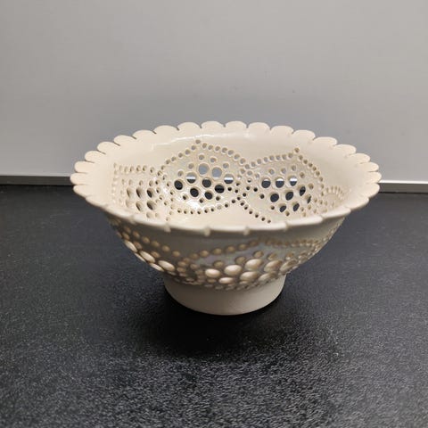 Kultakeramiikan sinivalkoinen tuikkukynttiläastia. Kaunista pitsikeramiikkaa. Korkeus 7 cm, halkaisija 11 cm. Siisti, ehjä.