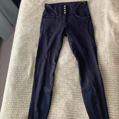 Hyväkuntoiset naisten tummansiniset ratsastuspöksyt! Takana on ratsastushousuille tyypillisesti erilaista kangasmateriaalia, tosin tässä se on ratkaistu käyttämällä sitä samaa juttua, mitä tyypillisesti on jarrusukkien pohjassa. Luulisi ettei tule siis pyllyllekään hiki ja muutenkin tekee näistä kyllä hyvin kauniit pöksyt, etenkin kun tuo jarrujuttu on kirkasta ja ihan kuin kiiltää :)