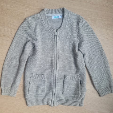 Käyttämätön Bogi neuletakki vetoketjulla, koko 116/122cm. 80% puuvillaa, 20% polyamidia.