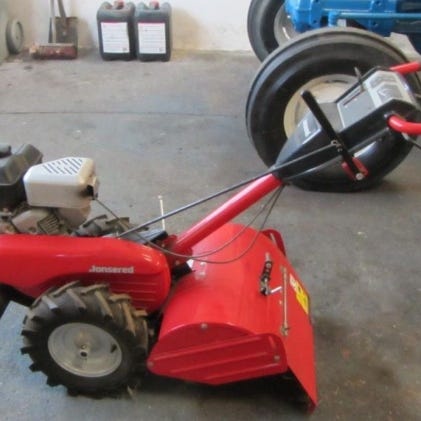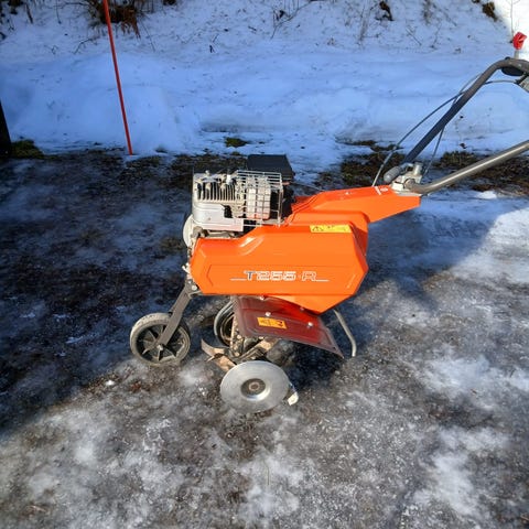 Puutarha jyrsin ja harjakone kuuluu kauppaan mukaan. Mukana 2 kpl pyörän painoja.