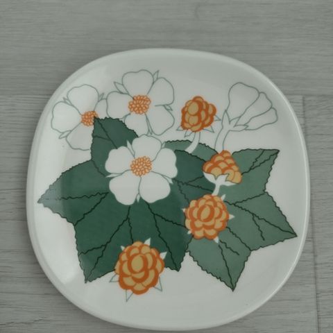 Arabian Lapin marjat -sarjan seinälautanen Pihlajanmarja, suunnittelija Kerttu Nurminen. Takapinnalta lohjennut pohjan lasitteesta n. 2 x 4 mm:n pala.