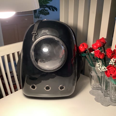Reppu on musta ja harmaa, ja siinä on säädettävät olkahihnat mukavaan kantamiseen. Reppu laajenee takaa vetoketjuilla jaettujen verkkopaneelien avulla. Sopii pienille lemmikeille, kuten kissoille tai pienille koirille. Reppu tarjoaa lemmikille hyvän näkyvyyden ja ilmankierron matkan aikana.