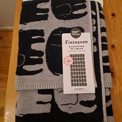 Elefantti kylpypyyhe,puuvillaa,harmaa-musta.koko 70x150cm,laput paikoillaan,puhdas ja hajuton.Hinta 30,00