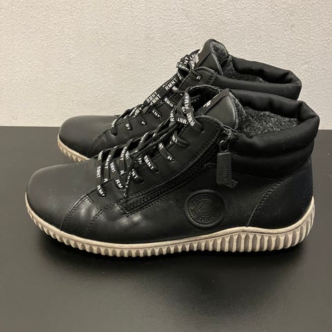 Uudenveroiset Camper- nahkanilkkurit. Vetoketjut sivulla. Kevyt pohja. Pohjan materiaalissa valkoisia "pilkkuja" mustalla pohjalla. Pohjallisen pituus 24 cm