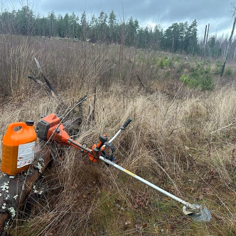 Puutavaranostimeen kiinnitettävä taimikon varhaisperkaukseen ja hyvissä ajoin tehtävään taimikon raivaukseen soveltuvan raivauslaitteen aihio. Raivauslaitteesta _puuttuu_ hydraulimoottori. Raivauslaitetta on käytetty traktorin keulalle asennetulla puutavaranostimella. Tee-se-itse -henkiselle henkiselle metsänhoitajalle kätevä vekotin metsän varhaishoidon koneellistamiseen.