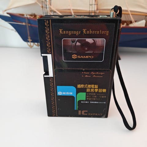 Vuoden 1975 tosi päheässä salkussa raahattava kielistudio, tai dokumenttien mukaan pienoiskielilaboratorio, joka tosin vahvasti muistuttaa myös vanhan liiton salakuuntelulaitteistoa. Virrat tulee ja kasetit pyörii. Pieni lommo päällä, muuten todella hyväkuntoinen. Luureissakin pehmusteet hyvässä kunnossa.