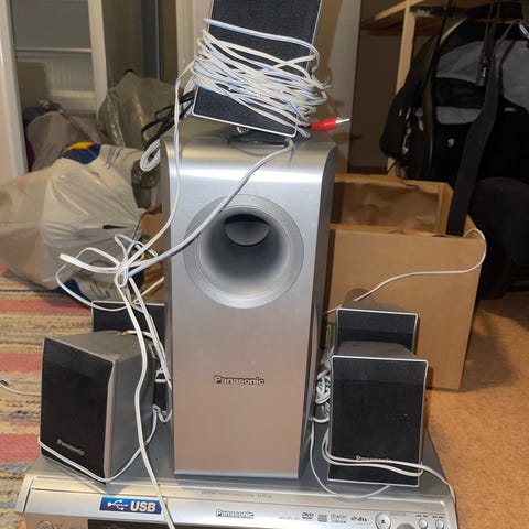 Tarpeettomana myyntiin toimiva panasonic surround äänijärjestelmä. Etukaiuttimille löytyy jalat mukaan ja kaikki piuhat löytyy.