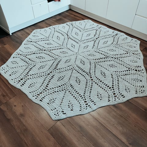 Iso suorakaiteen muotoinen olohuoneen matto. Luonnonvalkoinen väri, kaunis virkattu vohvelikuvio. Napakkaa tasalaatuista ontelokudetta.