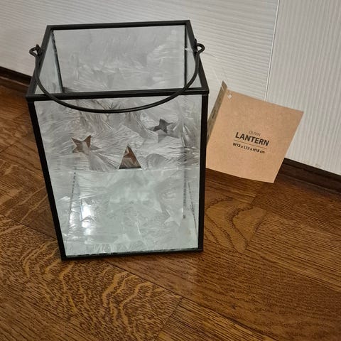 Vankkarakenteinen, paksua lasia. Lyhtyosan korkeus 30cm, ketju 25cm, Turkista.