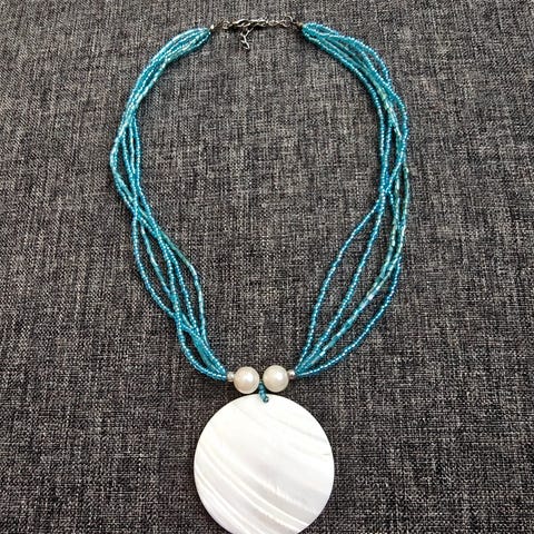 Makeanveden helmistä tehty korusetti, jossa kaulakoru, korvikset ja rannekoru. Kaulakorussa pitkä roikkuva osa on tarkoitettu eteen kuin riipukseksi. Uusi setti sopii itselle tai lahjaksi. Kannattaa katsoa myös muut ilmoitukseni ja ostaa samoilla postikuluilla.