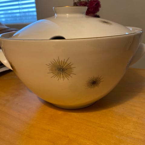 Hyväkuntoinen soppakulho, Arabia AS-malli. Korkeus 16,5 cm kannen kanssa, halkaisija 24 cm, paino 1,590 g, materiaali fajanssi. Malli suunniteltu vuonna 1936. Koristeet lasitteen alla. Ei iskeytymiä, halkeamia tai krakeloitumista. Pohjassa piippuleima ja luku 122 tai 422.