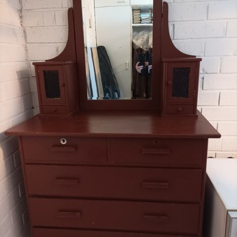 ***180€*** Alkuperäinen patinoitunut peili, ryhdikäs runko ikäisekseen, ollut koko ajan lämpimissä kuivissa tiloissa, helat vaihdettu, toinen vedinkahva puuttuu kaapista, on siisti.
