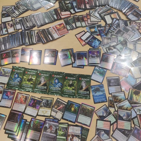Avattu pakkaus. Kortti pakat ovat avaamattomia.