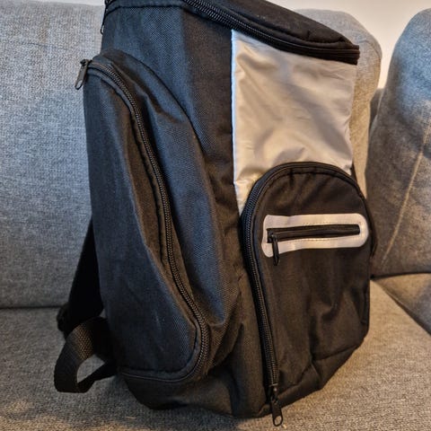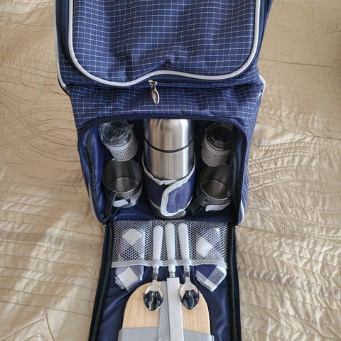 Repussa kaksi osastoa: kylmälaukku ja varustelaukku. Kylmäosiossa tavallisen kylmälaukun vuoraus, tarvikepuolella syömisvälineet. Kertakäyttölautaset mahtuvat muiden väliin, Reppu on mukavan kevyt ja sen korkeus on 40cm. Käytetty muutaman kerran, mutta kunto täydellinen. Hinta e30/tarjous