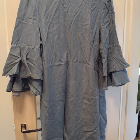 Uusi, tosi söpö farkkumekko. Kokomerkintä L, mutta pientä kokoa. Leveys mekon yläreunasta mitattuna 36,5 cm (ulottuu juuri rinnan alle), vyötärön kohdasta 41 cm. Materiaali joustaa hiukan.
