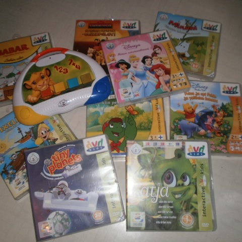 Hyvä kuntoinen, vähän käytetty matka DVD-soitin. Kaksi niskatukiin sidottavaa näyttöä ja kaukosäädin helpottavat takapenkin matkustajien tylsyyttä.