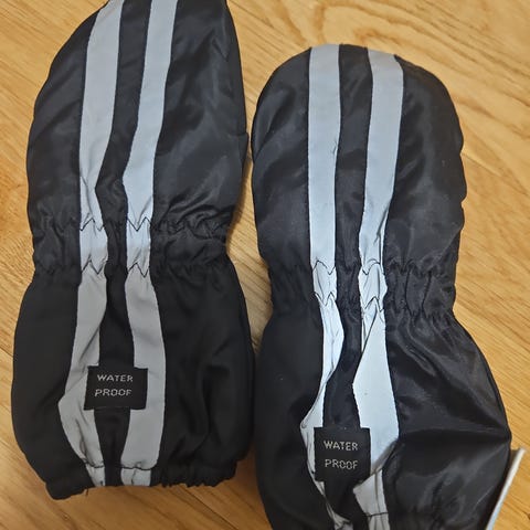 HC Outwear yhden lapsen käyttämät mustat hanskat välikauteen. Kokomerkintä 1-2v, mutta meillä meni vielä 3-vuotiaanakin. Kämmenen vahvistusosan sauma irvistelee molemmista hanskoista.