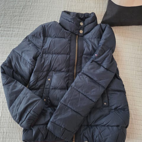 Tummansininen Tommy Hilfiger untuvatakki. Koko 128cm. Hihansuissa hiukan kulumaa.