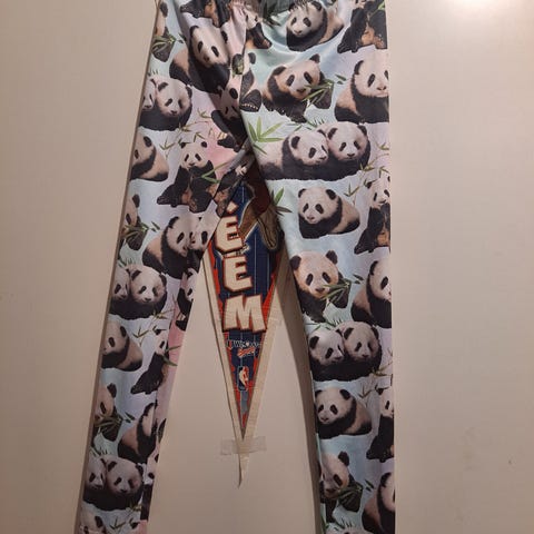 Lasten leggingsit, joissa on pandakuvio. Koko 140, sopii tytöille. Materiaali on mukavan joustavaa ja pehmeää, tarjoten hyvän liikkuvuuden ja mukavuuden päivittäiseen käyttöön. Liukaspintainen materiaali, ei kulumia.