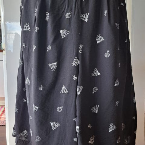 Seventa-merkkinen värikäs vintagehame todennäköisesti 70- tai 80-luvulta. Sileää ja melko ohutta liehuvaa kangasta. Toisella puolella tasku. Valmistettu Suomessa.