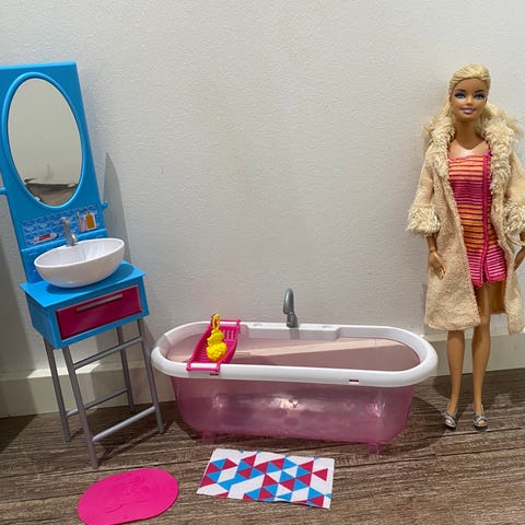 Paljon leikitty ja käytetty, mutta edelleen hyvässä kunnossa oleva Barbien astianpesukone. Mukaan tulee kuvassa näkyvät tavarat.